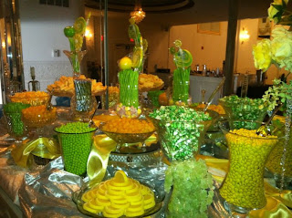 Candy buffet decorated with green & yellow. Centerpiece had limes and lemons in the vase, with a floral arrangement on the top.