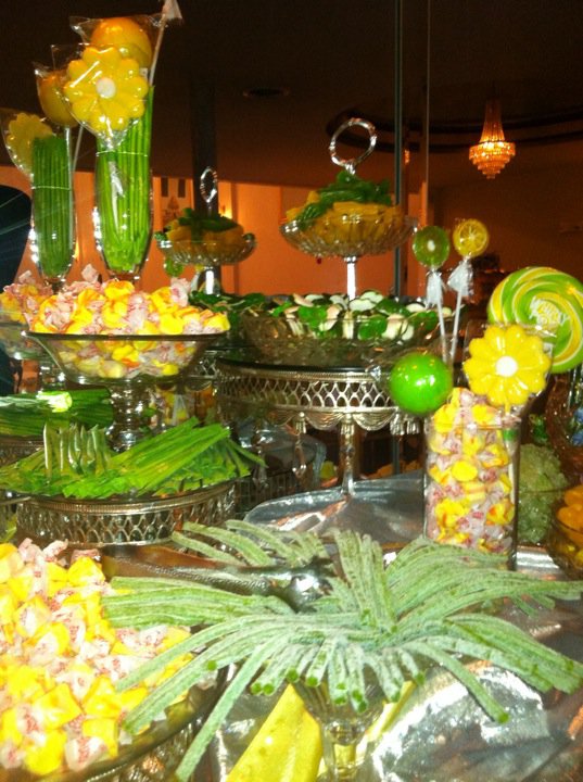 Candy buffet decorated with green & yellow. Centerpiece had limes and lemons in the vase, with a floral arrangement on the top.