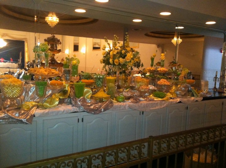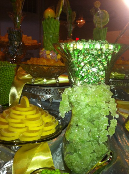 Candy buffet decorated with green & yellow. Centerpiece had limes and lemons in the vase, with a floral arrangement on the top.